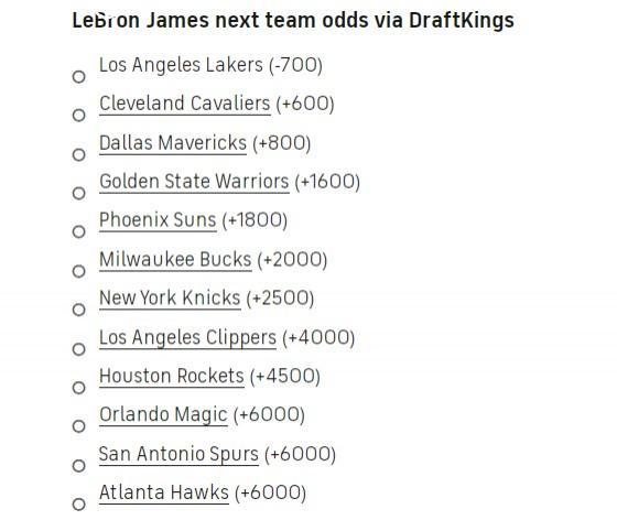 直播吧7月12日讯 近日美媒Draftkings晒出詹姆斯最新下家赔率,湖人第一,骑士排第二,独行侠位列第三,勇士第四。